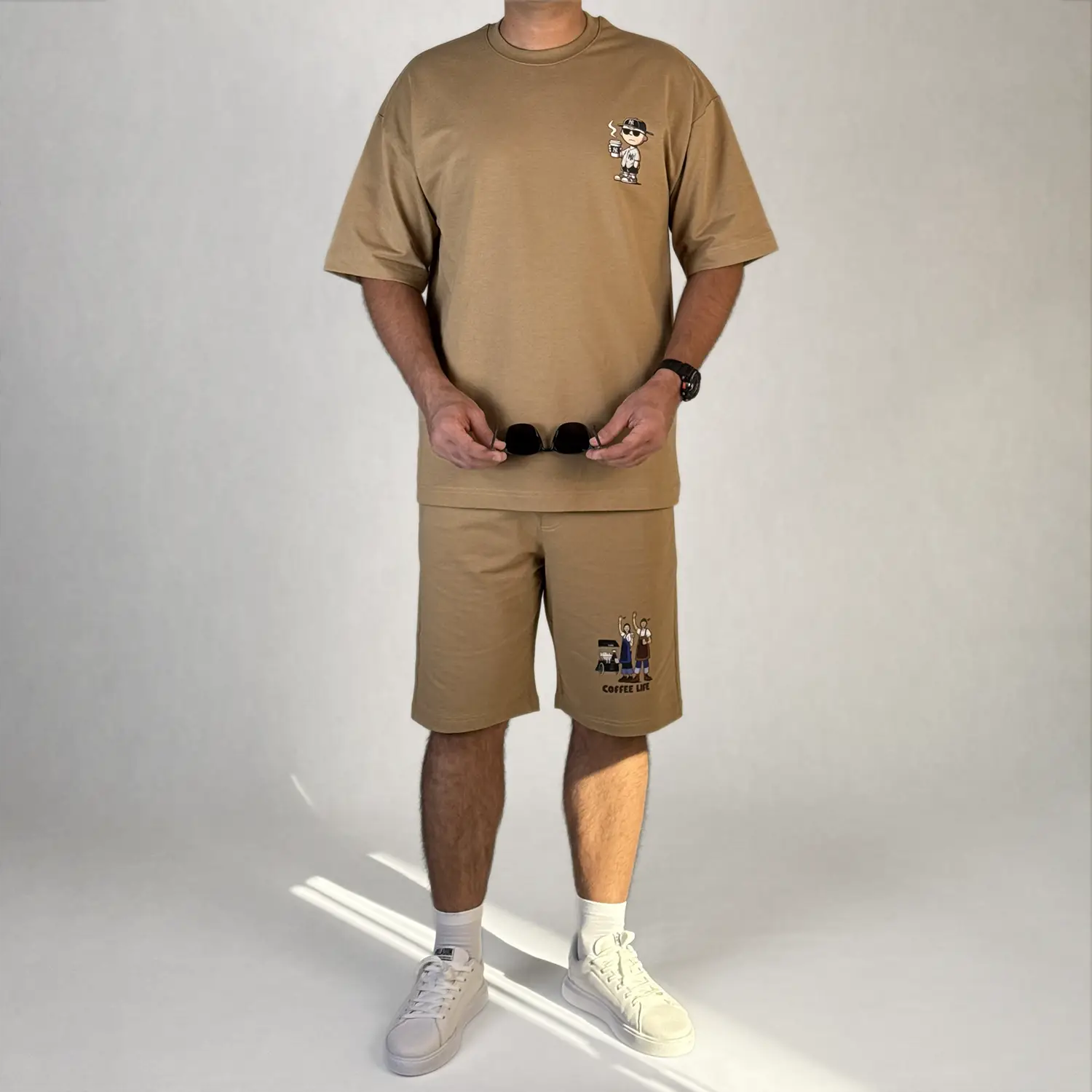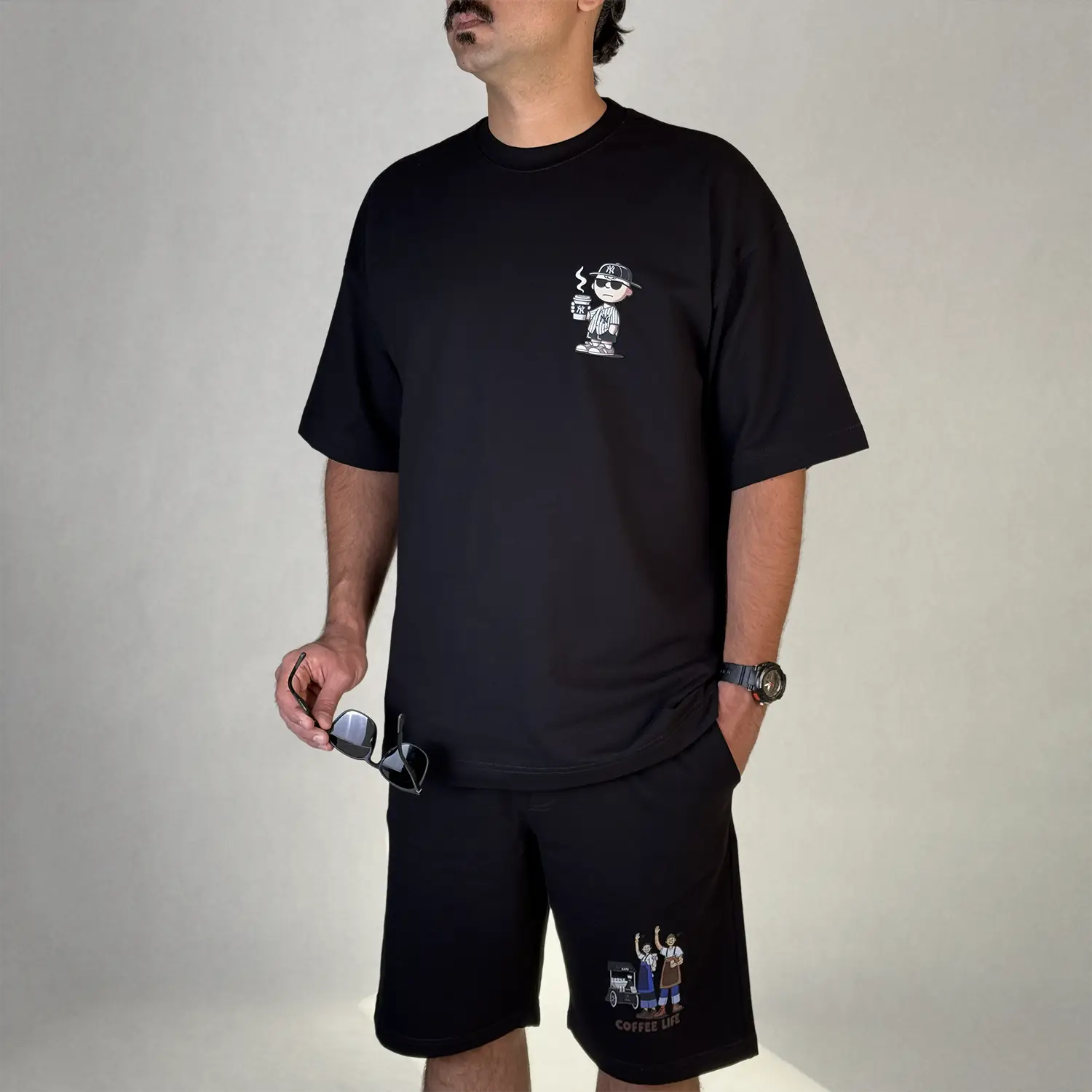 ست تیشرت و شلوارک Coffee Life با طراحی کارتونی با تم قهوه، انتخابی خاص برای کسانیست که دنبال استایل متفاوت و پرانرژی هستند.در قسمت سینهی تیشرت، تصویر شخصیت کارتونی با لباس بیسبال نیویورک و فنجان قهوه دیده میشه که حس شهری و مدرن رو منتقل میکنه. در قسمت شلوارک، چاپ جذاب سه شخصیت در کنار واگن قهوه با نوشتهی "COFFEE LIFE" قرار گرفته که به لباس هویت و داستان میده.